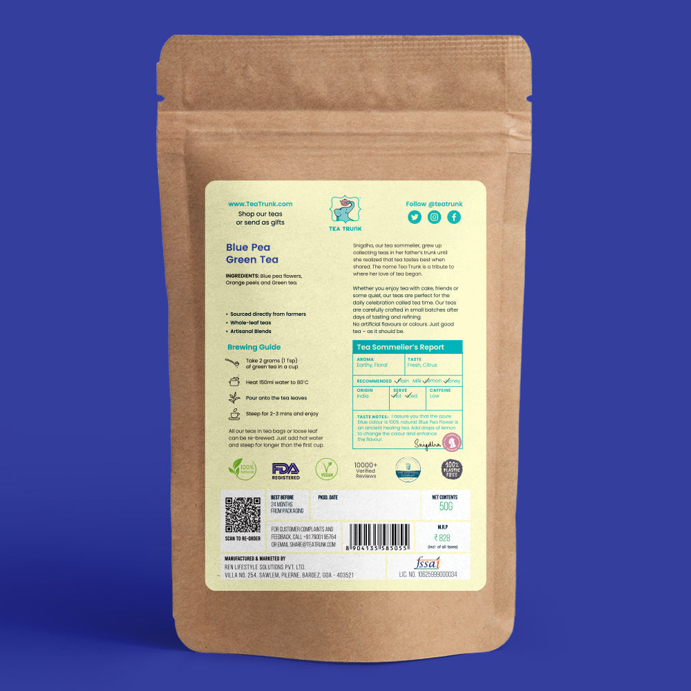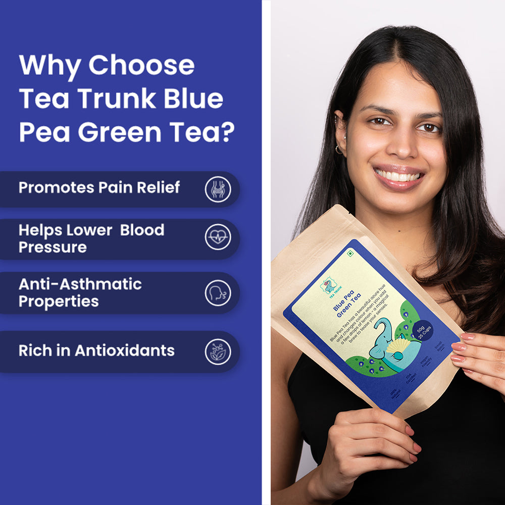 Much like green tea, Blue Pea Green Tea is rich in antioxidants that promote detoxification and support overall health. Known for its beauty-boosting properties, this tea also acts as a brain booster, improving memory and cognitive function. Clitoria Ternatea, the scientific name for blue pea flower, is revered in Ayurveda for its ability to lower blood pressure and offer anti-anxiety, anti-asthmatic, and pain-relieving benefits.