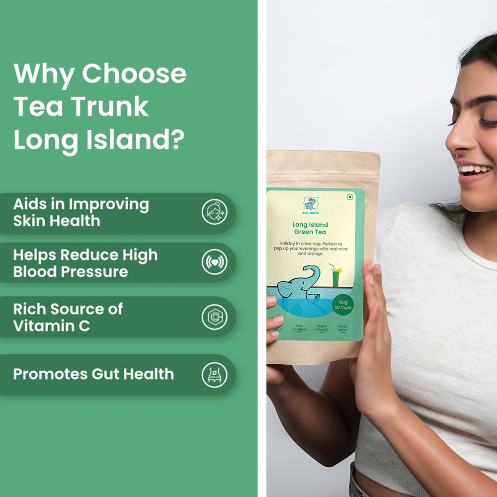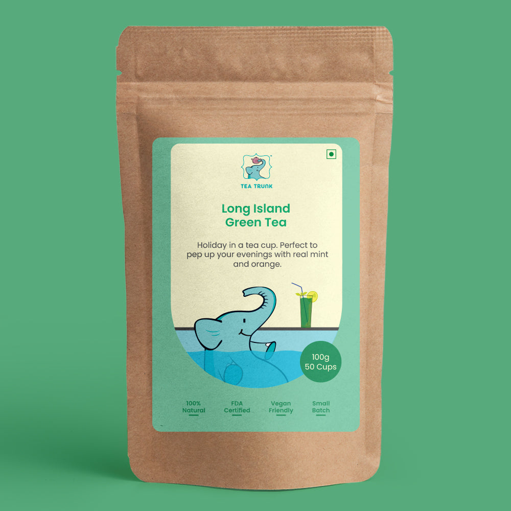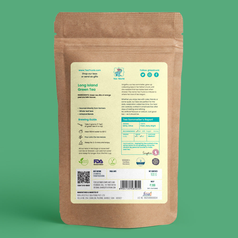 Long Island Green Tea offers a refreshing blend of cool mint, zesty orange peel, and smooth green tea. The flavor is crisp, citrusy, and subtly sweet with a cooling finish.