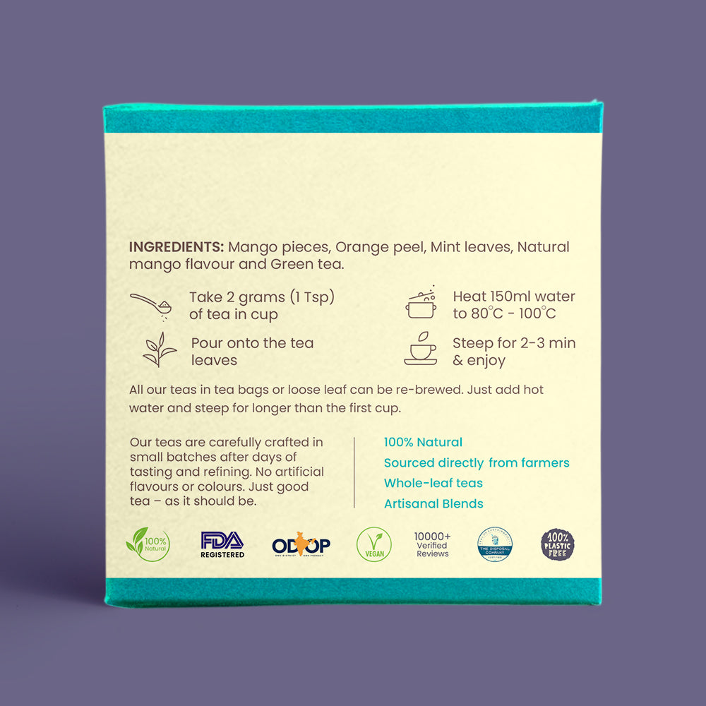 Green Tea-Darjeeling, India ; Mango - Gujarat, India ; Mint - Maharashtra, India