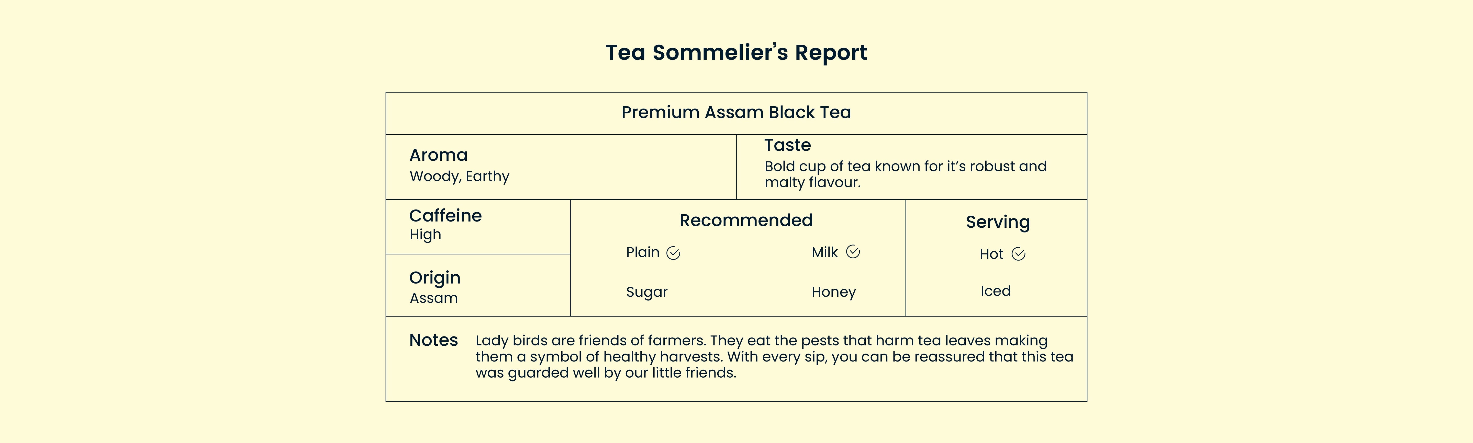 Lady birds are friends of farmers. They eat the pests that harm tea leaves, making them a symbol of healthy harvests. With every sip, you can be reassured that this tea was guarded well by our little friends.
