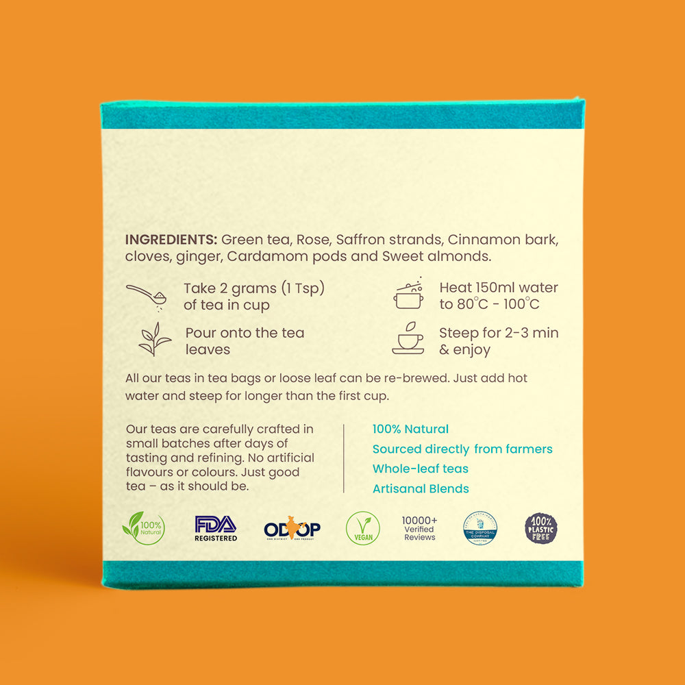 Green tea leaves, Cardamom, Cloves, Cinnamon, Ginger, Almonds, Rose petals and Saffron Strands from Kashmir.