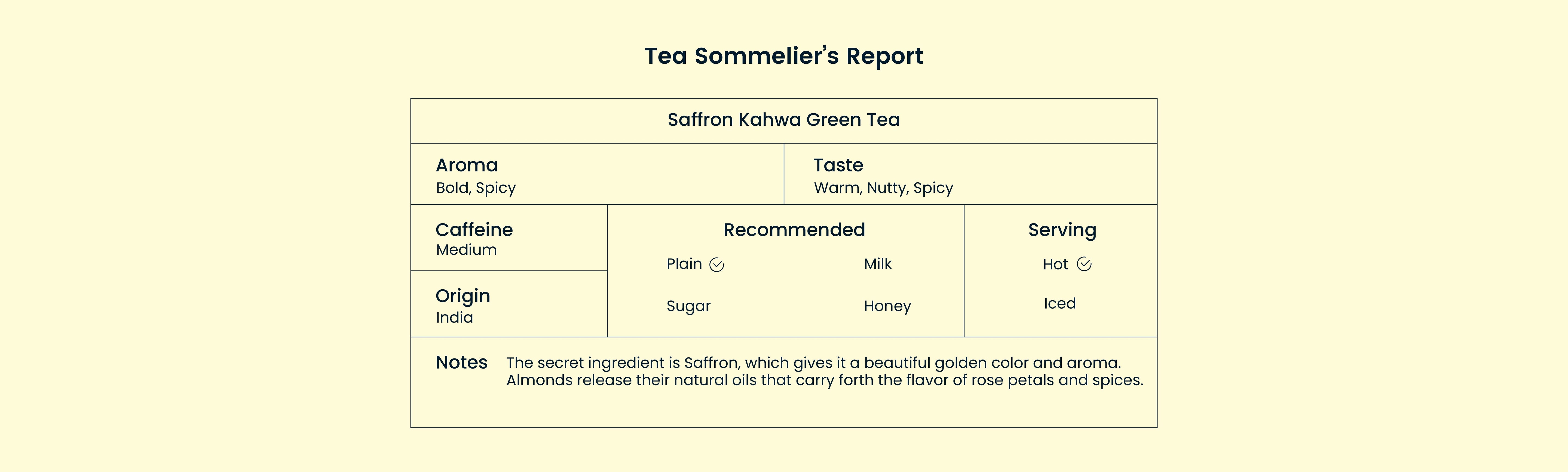 Saffron Kahwa Green Tea is a blend of green tea, saffron, and aromatic spices, inspired by the traditional Kashmiri drink, Kahwa.