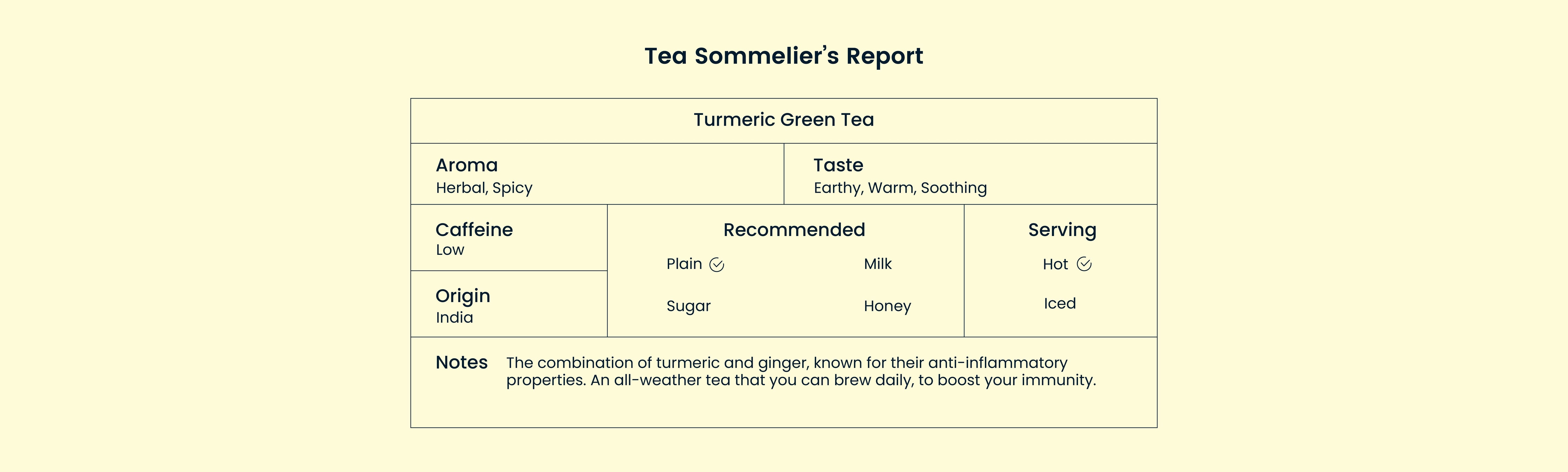 Turmeric Green Tea has an earthy, slightly spicy flavor from turmeric, balanced by the fresh, grassy notes of green tea. It has a warm and soothing taste, perfect for a comforting brew.